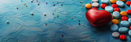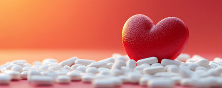 Red heart shaped pill stands upright on a scattered pile of various white, blue, green, and yellow medication. symbolizing health, cardiology, and pharmaceutical care.