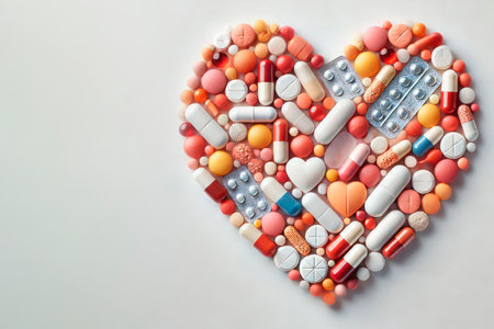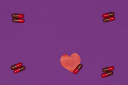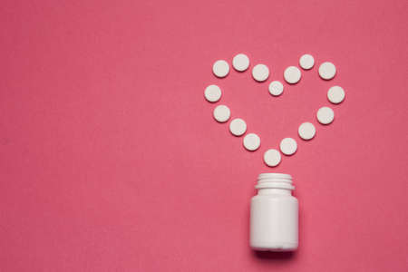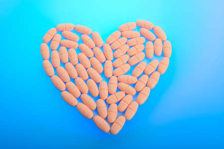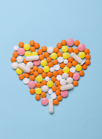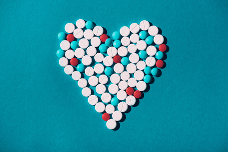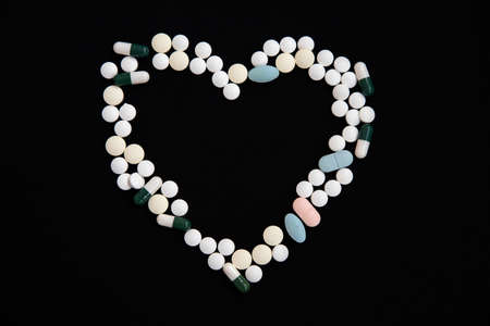 Assorted pharmaceutical medicine pills, tablets and capsules for the treatment of heart disease. Heart shape of pills. Copy space for text