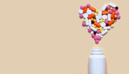 Medical concept. Assorted banner of pharmacological preparations, pills and pills in the shape of a heart from a bottle. Treatment with pills. Place for text.