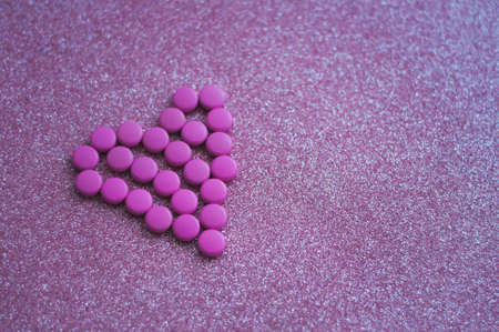 pink pills laid out in shape of a heart on glitter pink background. coloured drugs. concept - heart disease, heart disorders and drugs, cardiology, valentines, love,
