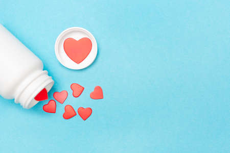 red pills in the shape of hearts and white jar. Symbol of love. love pills. Pills for heart health.