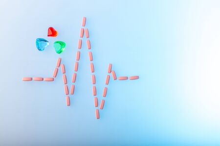Pills in shape of cardiogram pulse on blue gradient background. Pink vitamins and glass hearts, symbol of healthy lifestyle and copy space. Heartbeat rhythm made of tablets