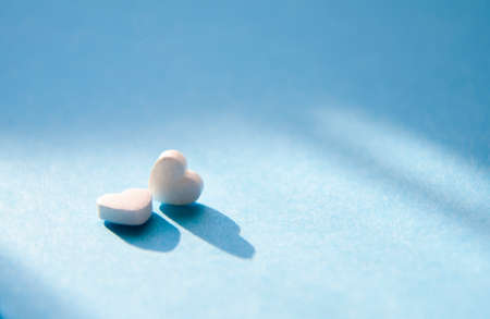 Two white heart-shaped medical pills on a blue background with copy space. Card to the day of the doctor. Concept Valentines Day, minimalism.
