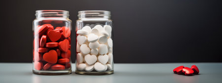 heart-shaped tablets of white and red color in a glass jar. Valentine's Day banner.