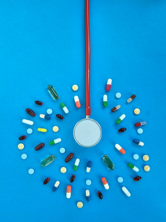 Stethoscope surrounded by various pills and capsules on a blue background highlights healthcare and medication diversity