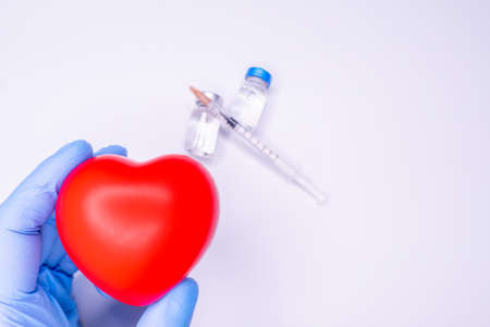 a hand in a medical glove holds an ampoule containing the covid-19 vaccine, invented to prevent the spread of the virus around the world. mask with a red heart on a white background