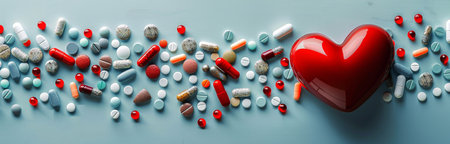 Explore essential heart health info, featuring medical elements like pills and a central heart icon on a clean background.