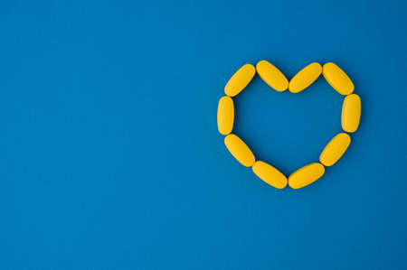 Medical background from heap of yellow pills in the shape of a heart on a blue background, copy space, top view, flat lay. Heart made of yellow pills on a blue background, Medicines for heart disease