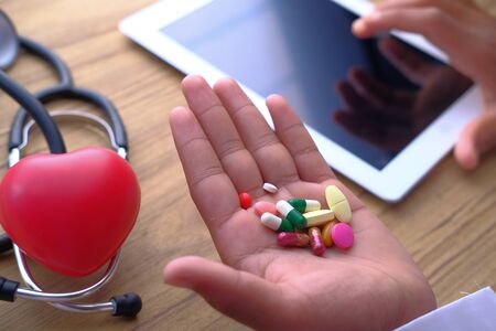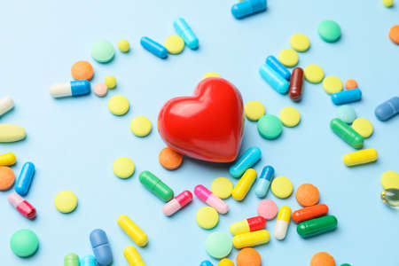 Cardiological pills and heart disease and normalization of heart rhythm. Medical drugs for prevention of heart disease concept