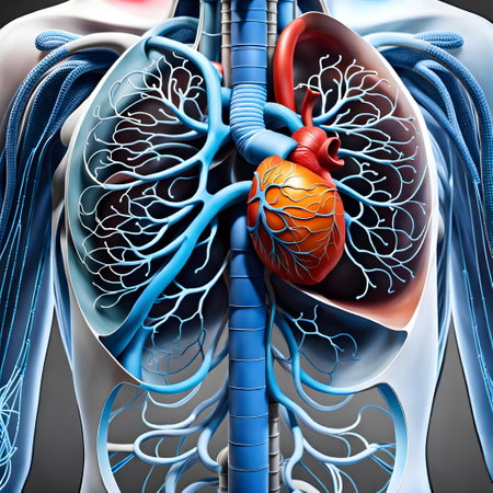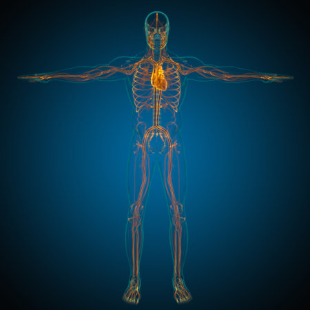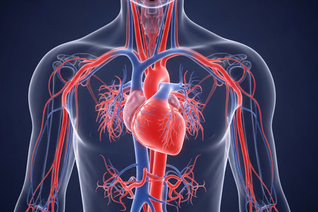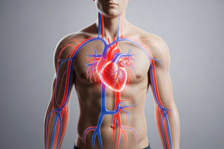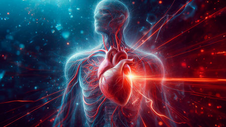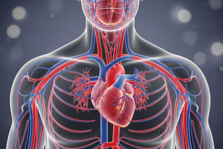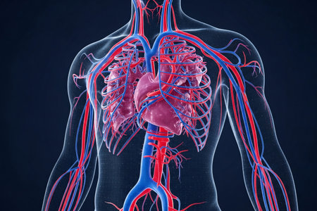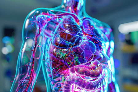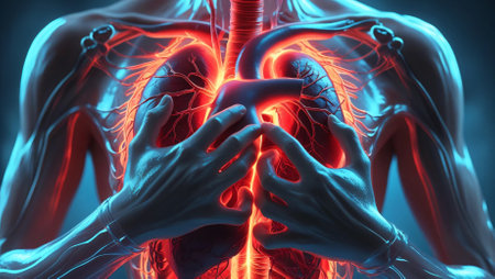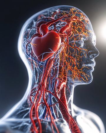 A luminous digital rendering emphasizes the intricate network of blood vessels and the central organ within a human torso, illustrating circulatory pathways in high-