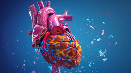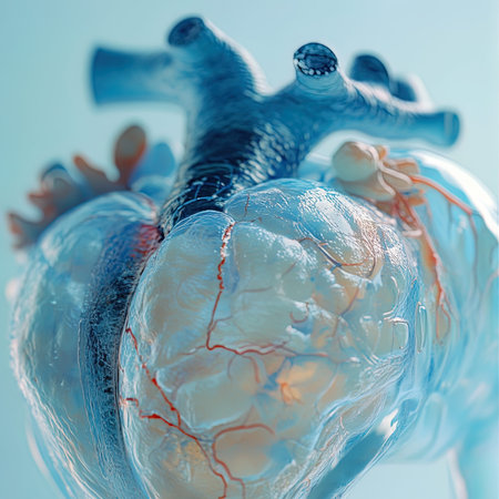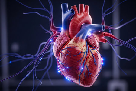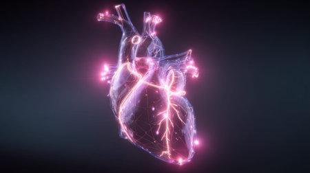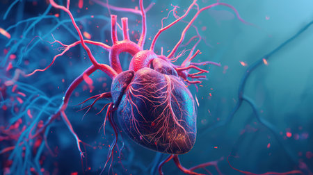 A highly detailed D rendering of a human heart with visible arteries and veins, set against a dark background, emphasizing its complex structure