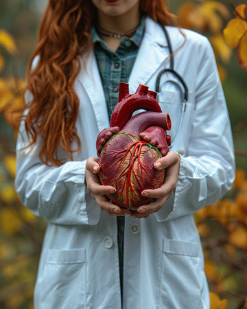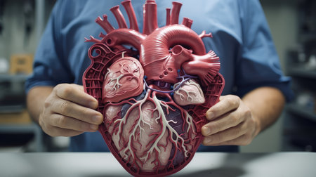 Doctor in white coat demonstrating a lifelike model of the human heart in their hands