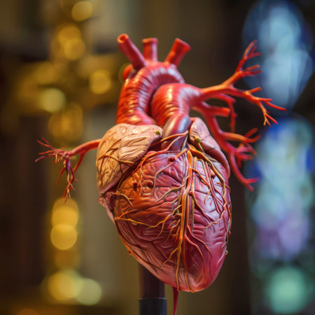 A beautifully crafted anatomical model of a human heart is prominently displayed within the interior of a grand cathedral. The intricate design showcases the heart's chambers and arteries, surrounded by stunning stained glass windows that cast colorful light around the exhibit. Visitors can observe the lifelike details up close in this unique setting.