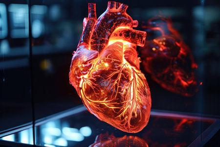 A glass display in a museum showcasing a human heart, providing a detailed view of its anatomical structure, Holographic visualization of a human heart, AI Generated