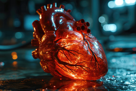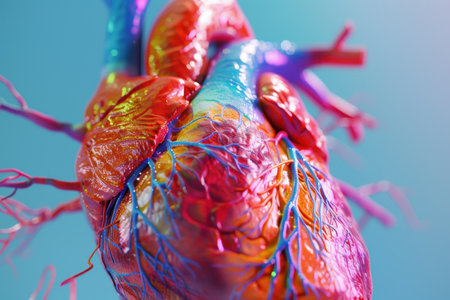 The intricate design of a human heart model features glowing veins and textures against a vibrant background, showcasing its structure and complexity in a laboratory context.