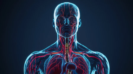 A full-body representation of the human form showcases the circulatory system. Red vessels and the heart are vividly illustrated. The image, set against a blue background, features detailed anatomical renderings suitable for educational or scientific applications. It could serve varied commercial purposes, including medical presentations or health publications.