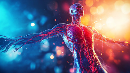 Stunning 3D rendering of a human anatomical model with a focus on the vascular system, set against a vibrant and colorful background for educational and artistic purposes.