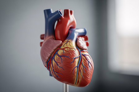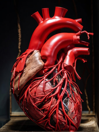 Close-up of a human heart model with arteries, emphasizing the complex circulatory system