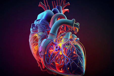 This vividly portrayal showcases a human heart glowing with dynamic colors. The heart appears lifelike, radiating a warm light in a dark setting, emphasizing its intricate details.