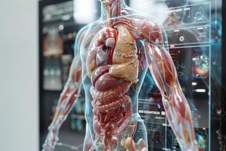 A man's body is shown in a 3D image, with the organs and muscles clearly visible. Concept of awe and wonder at the complexity of the human body, as well as a sense of scientific exploration
