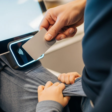 A person makes a secure NFC payment with a glowing card at a contemporary retail counter, showcasing modern transaction technology.