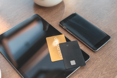 Digital gadget lying on table with plastic credit card for online shopping. High angle above top view or overhead, flat lay photo of cafe with modern interior with soft and natural daylight