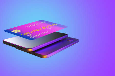 Smartphone layouts and a credit card. The concept of electronic payments. Payments using a mobile application. Credit by bank card. Lilac background with a mobile phone and a bank card. 3d rendering