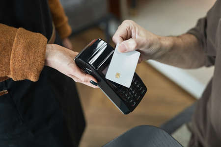 Close-up of unrecognizable customer paying with contactless card and putting it to terminal held by waitress in cafe