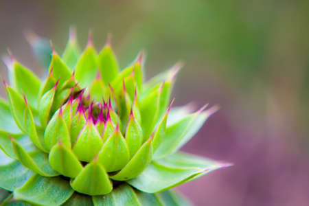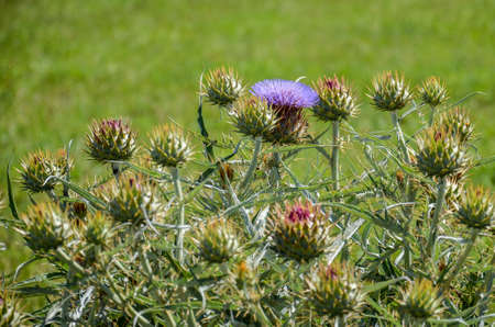Close-up of a spined bud of galactites tomentosa blooming in the wild