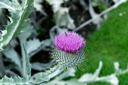 Purple flowering Thistle in autumn. Beautiful purple flower of the Silybum marianum on a background of greenery
