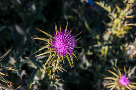 Scottish thistle. Purple thorny thistle flower. Nature. Closeup.