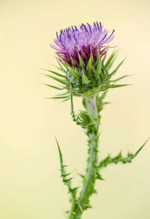 Close up of a milk thistle flower (Silybum marianum) Purple milk thistle blossom on yellow blurred background.