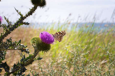 A butterfly on a thistle flower. Front view.