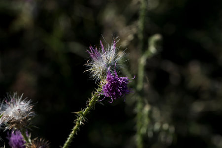 beautiful purple thistle flower blooms in the meadow, narrow focus area, contour light