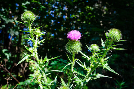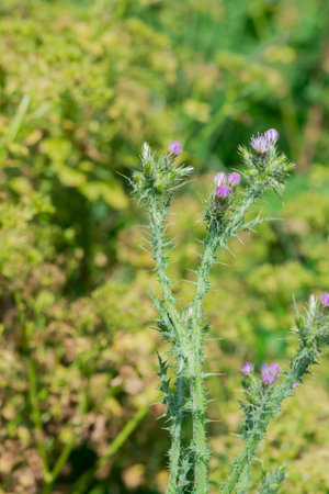 Cirsium vulgare, common thistle, bovine thistle, common thistle, thistle plant short, with spiky winged stems and leaves, pink-purple flower heads surrounded by prickly. Background.
