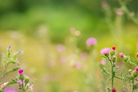 Close up of thistle flowers in the field. Selective focus.