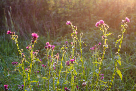 Purple thistle flowers blooming in the meadow at sunset