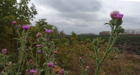 Thistle thistle flower on a background of autumn gray sky