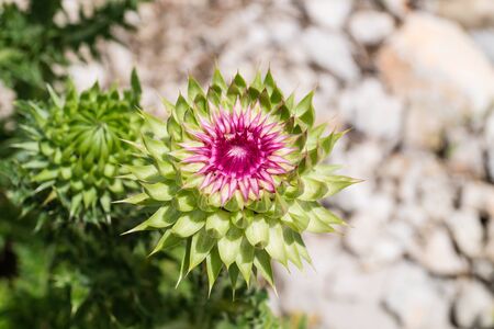 pink milk thistle flower in bloom in spring