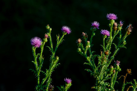 Close-up of a group of purple thistle plants and spiny stems against a dark background on a sunny summer morning