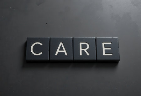 This stock photo features a creative layout of black tiles spelling CARE, perfect for conveying themes of kindness, support, and positivity in design projects.