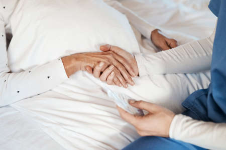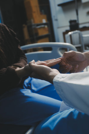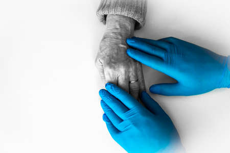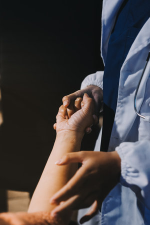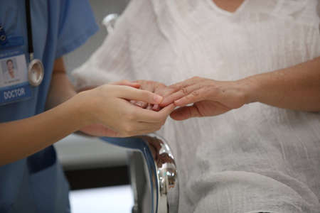 Closeup of holding hands while sick , Hand of doctor touching old woman in hospital