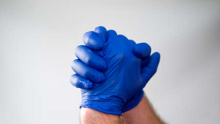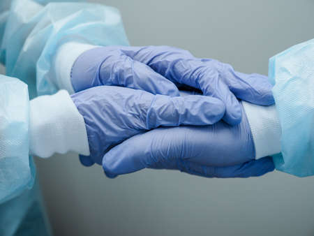 Handshake of two doctors' hands in medical gloves