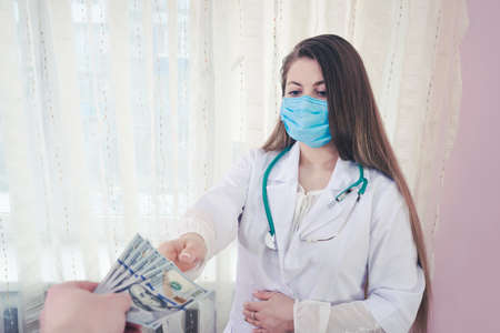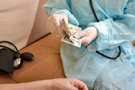 Doctor's hands taking bribe, hundred dollar banknotes