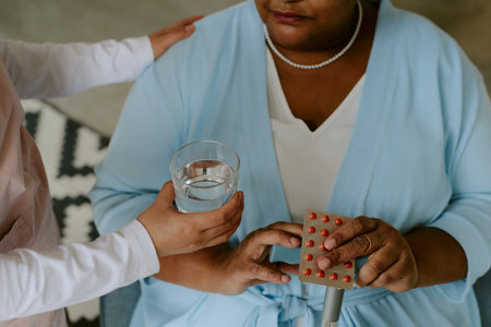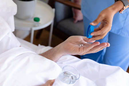 Mid section of biracial female health worker giving medical pills to caucasian senior man on the bed. Medical care and retirement senior lifestyle concept