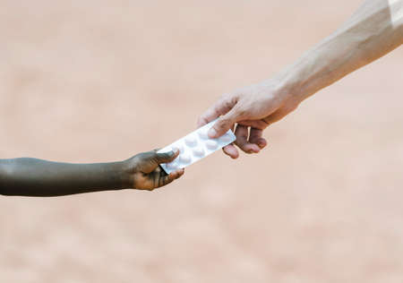 Adult caucasian hand giving medicine to african child hand on beige background