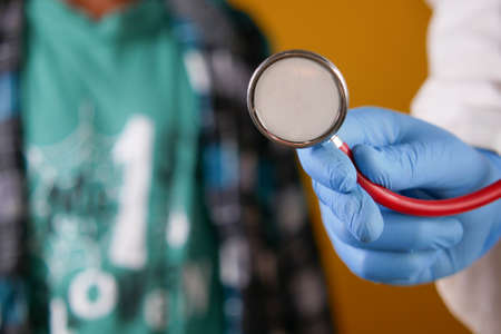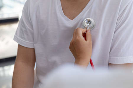 Doctors are using a stethoscope to examine the patient's heartbeat, physical examination and health care to keep up with the disease so that it can be treated promptly. Concept of physical examination