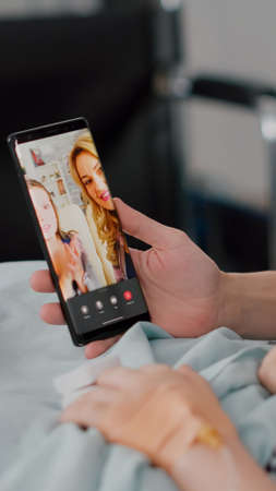 Mother with sick daughter having online videocall meeting conference discussing with remote family using phone during disease examination in hospital ward. Child suffering medical surgery