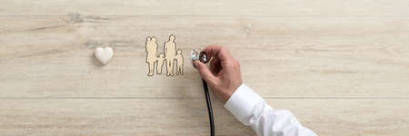 Doctor holding medical stethoscope over a cut out of a young family with three kids, life insurance concept.