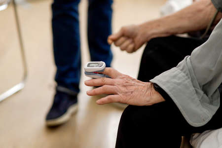 Details with the hand of a senior patient wearing a pulse oximeter on the finger at the doctor’s cabinet.
